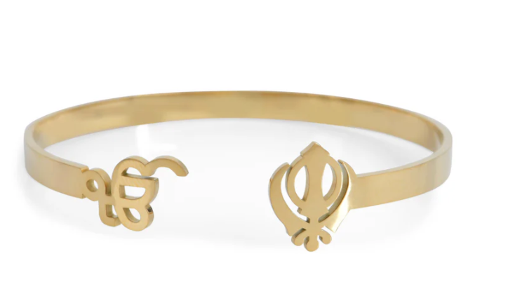 Twist-style bangle with an 'Ik Onkar' motif on one side and 'Khanda' motif on each side.