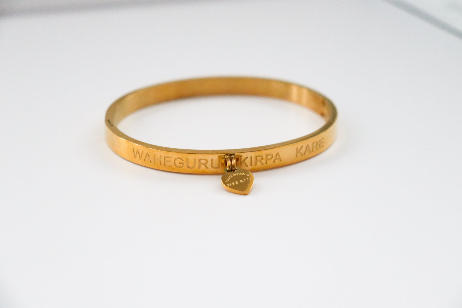 Waheguru Kirpa Kare Bangle Carry grace wherever you go. This elegant bangle is delicately engraved with “Waheguru Kirpa Kare,” a heartfelt reminder that every step is guided by Waheguru's blessing.