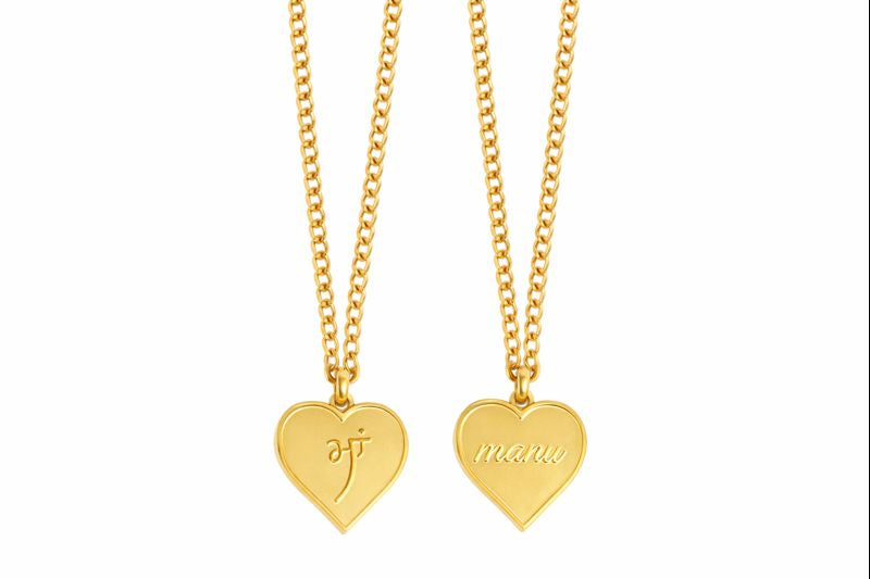 Elegantly crafted, these 18k gold-plated heart-shaped necklaces boast intricate designs, featuring Ma in both Punjabi and English on the reverse side.