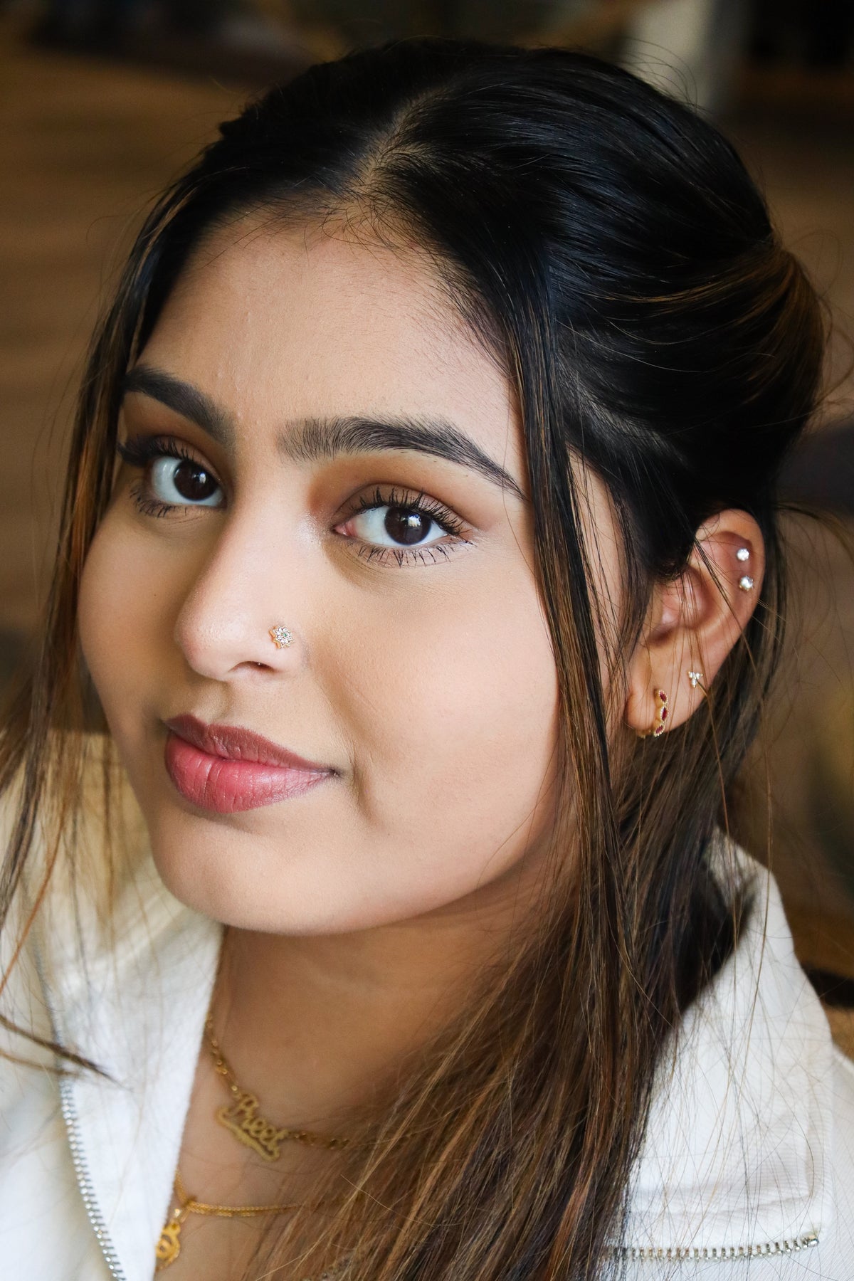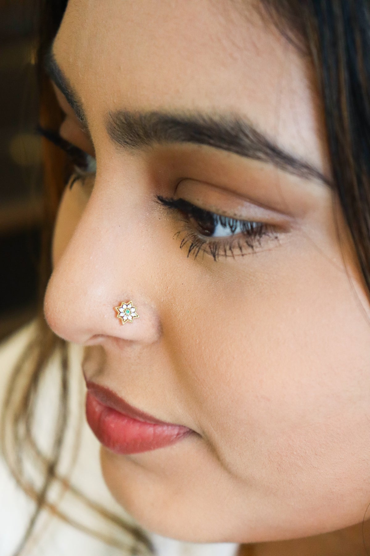 Delicately crafted like a tiny blooming flower, this nose pin features a radiant emerald-green stone at its heart. Petite, feminine, and effortlessly graceful.